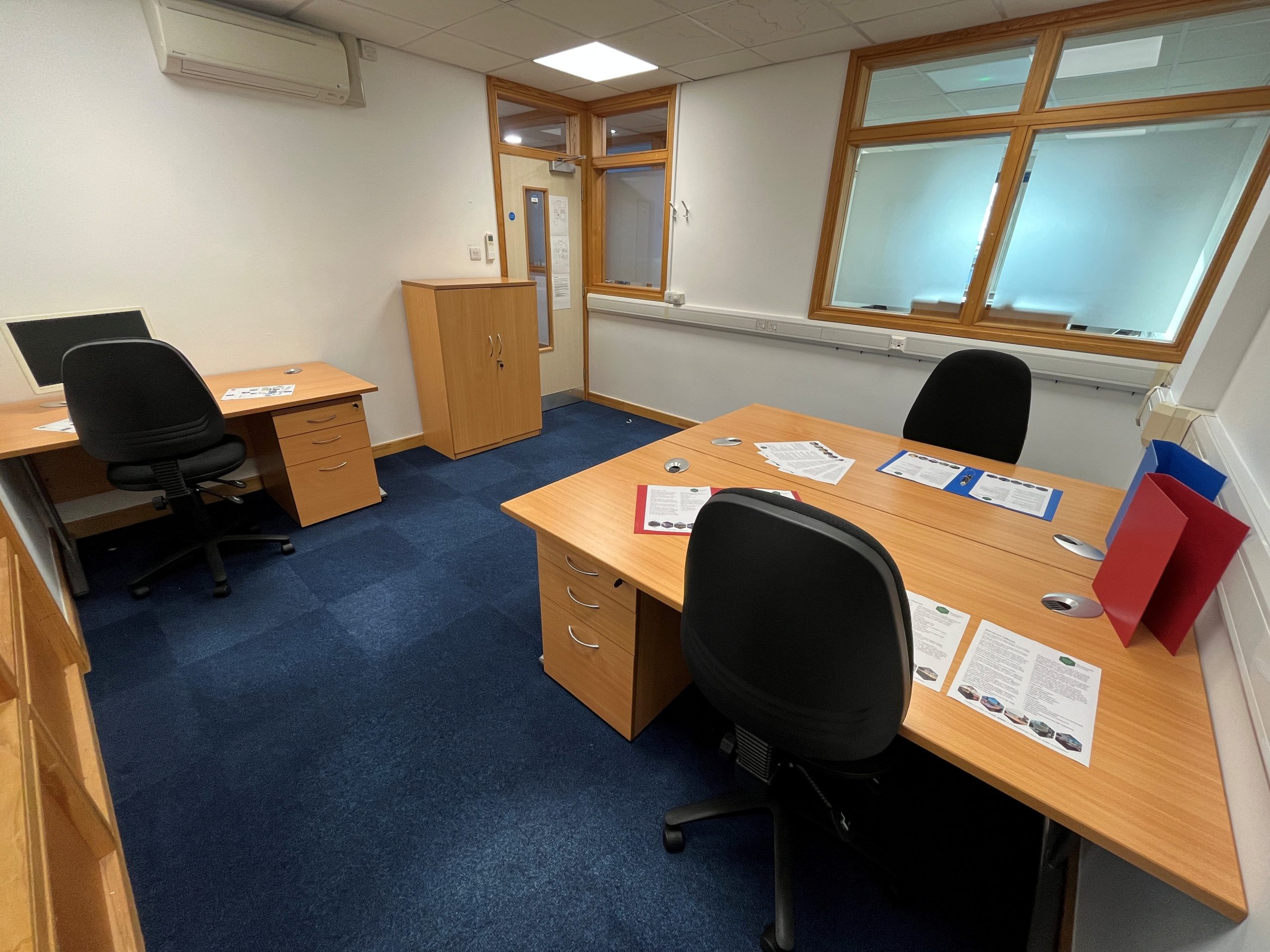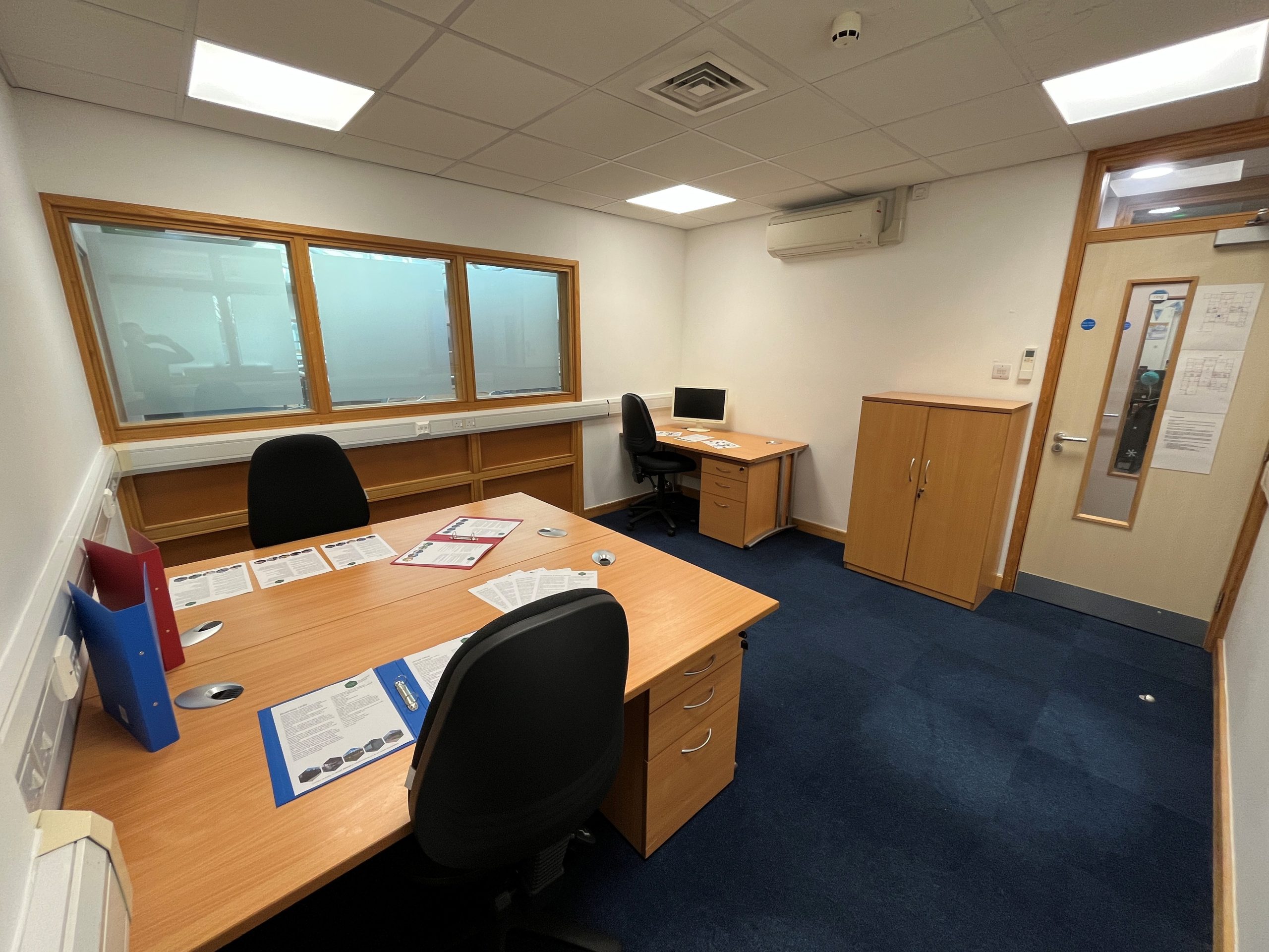 Room 122 is a 3 person Serviced Office located on the first floor in Capability House, benefiting from a short walk from the communal kitchen and communal breakout area. This office also has air conditioning.